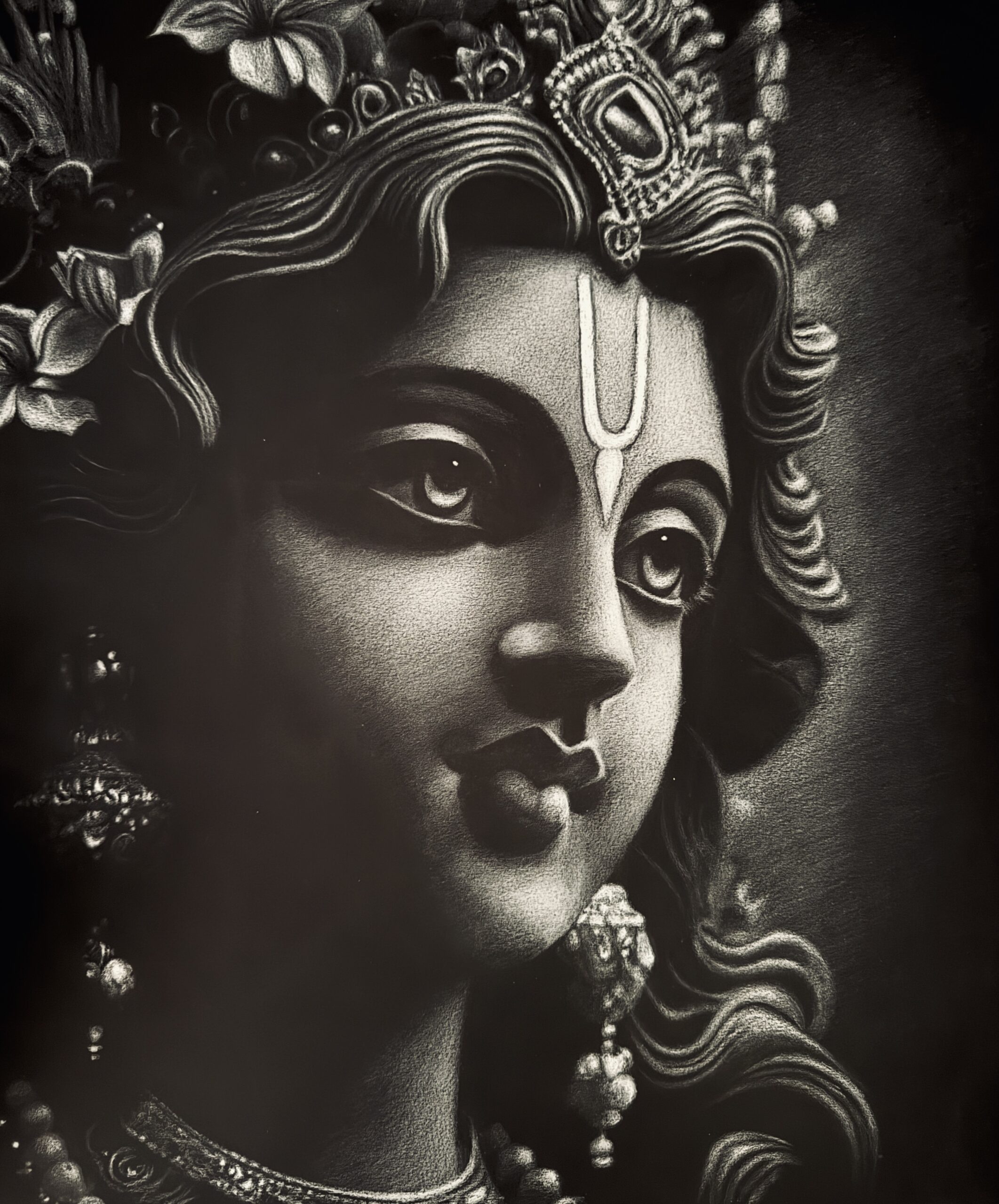 In this artwork, I’ve tried to capture the enchanting grace of Krishna—the serene confidence of a soul who knows the truth of existence. His playful yet profound energy invites to transcend the fears, and to live with devotion and joy. His eyes, calm and full of emotion, hold the kind of love that draws you in, not with force but with a quiet allure. The black and white tones strip away the noise of the world leaving only him and you—no distractions, no distance. It feels like he’s waiting, not as a god on pedestal, but as the beloved your soul has known before the time began.